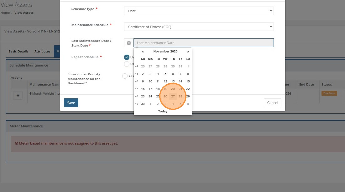 Note if this is meter based, capturing the meter reading will reset the meter to start the next maintenance cycle.