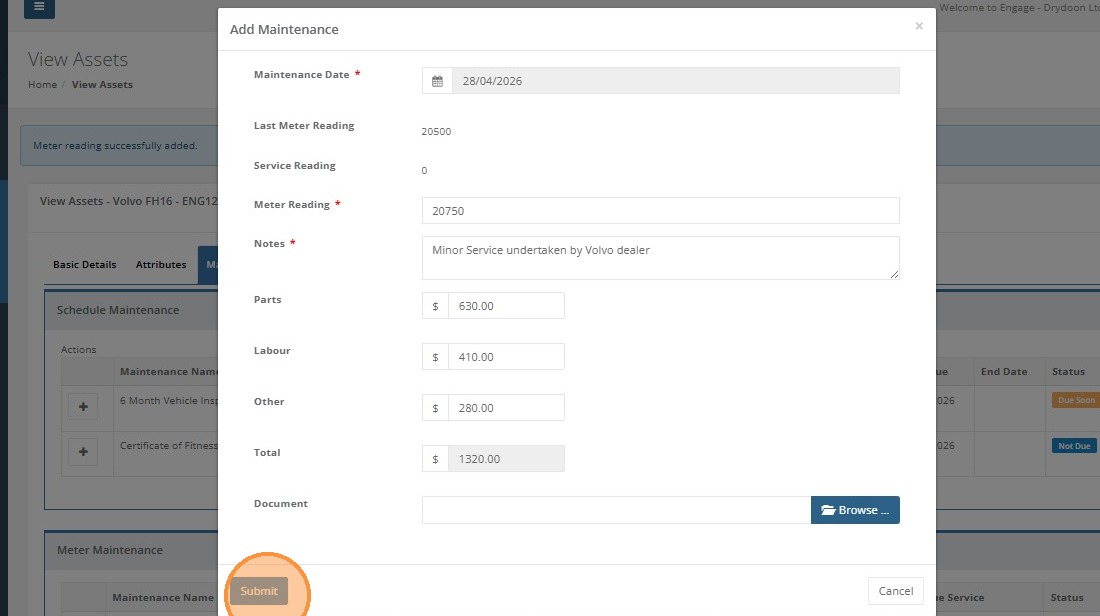 Complete all the relevant fields including any costs associated, or documents (Inspections, reports, invoices etc) and then click 'Submit'.