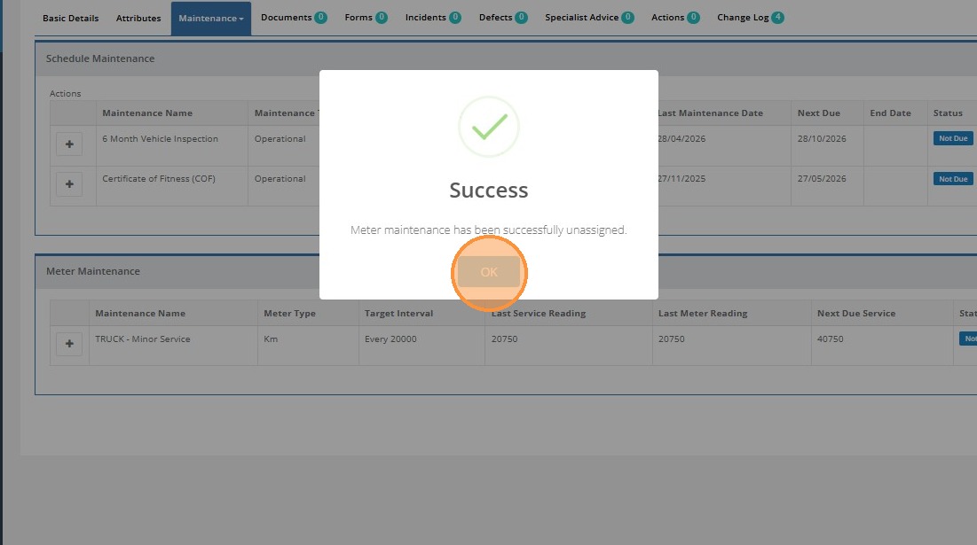 If required, you can unassign a maintenance schedule from an asset by clicking the 'Unassign Maintenance" icon on the right of the schedule. To ensure no information is lost however, any previous history will be added to the 'Past Maintenance' records at the base of the schedule information.